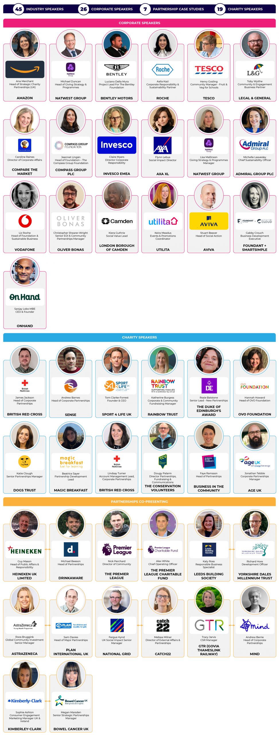 Please check the Corporate Charity Partnerships website regularly for programme updates and confirmed speakers. For more information or to get involved, please call 44 (0)20 3479 2299 or email event@partnershipsconference.com