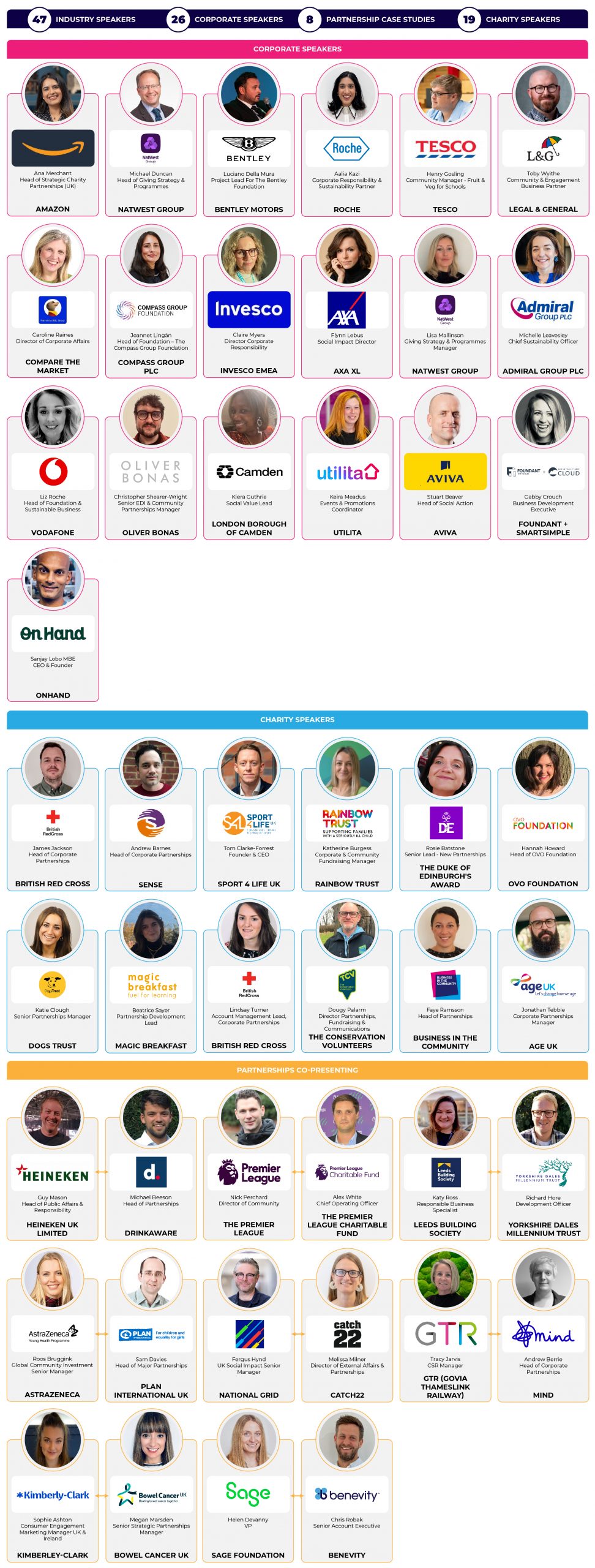 Please check the Corporate Charity Partnerships website regularly for programme updates and confirmed speakers. For more information or to get involved, please call 44 (0)20 3479 2299 or email event@partnershipsconference.com